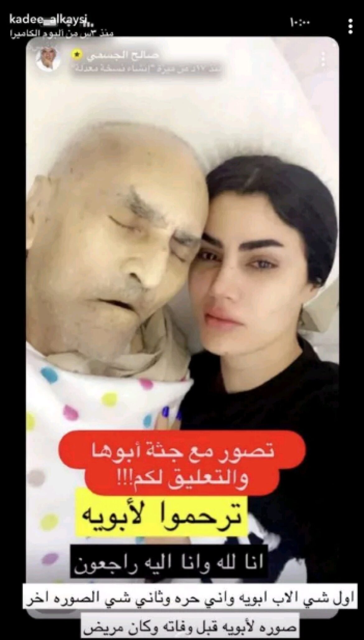 وقالت: “اول شي الاب ابويه واني حرة، وثاني شي الصورة اخر صورة لأبويه قبل وفاته وكان مريض”.